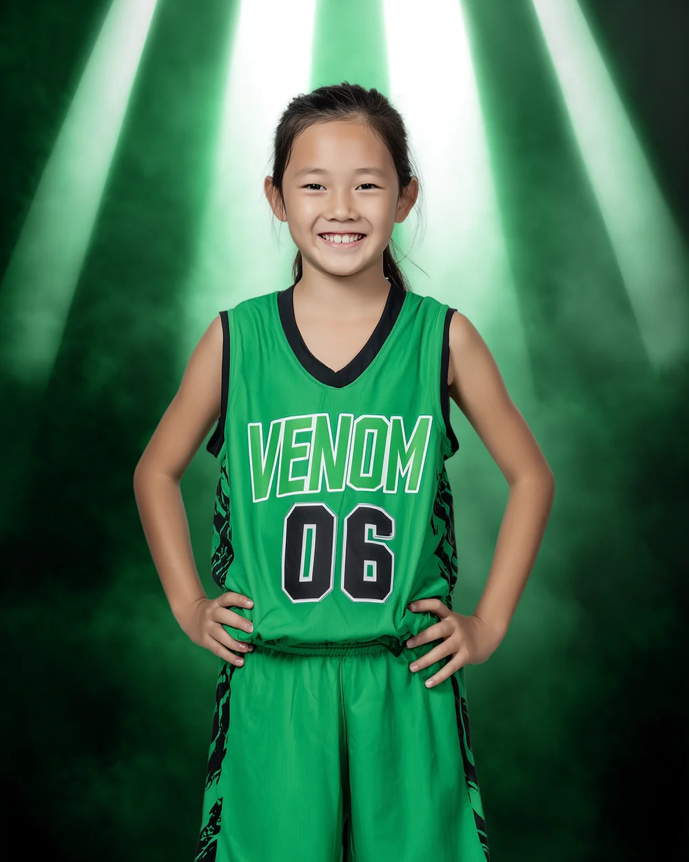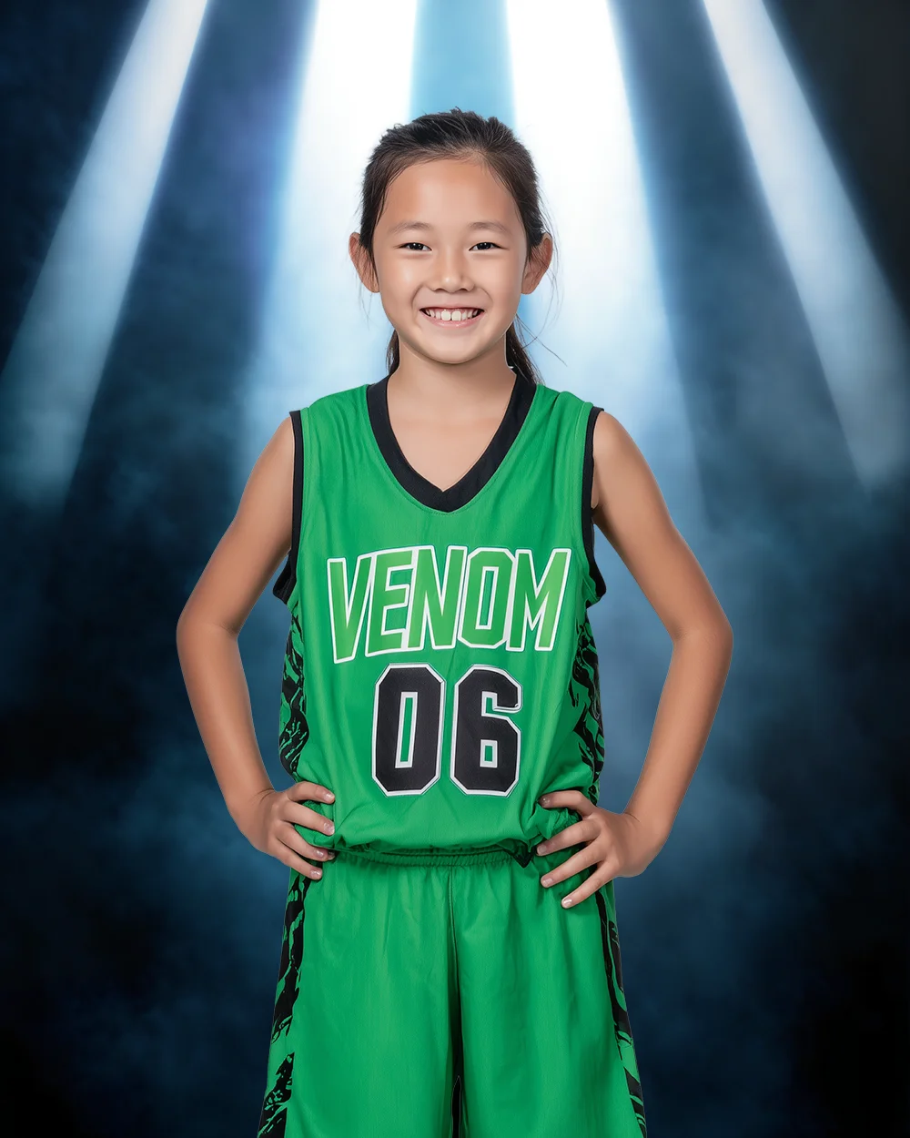 This digital background is color adjustable, allowing you to shift the beam colors, ambient haze, and overall tone to match team branding or your preferred creative style. Its clean, modern structure makes it versatile for a wide range of sports and portrait compositions.