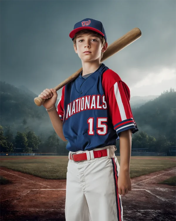 This digital background, Baseball Forest, features a natural outdoor ballpark setting framed by distant mist-covered trees and soft rolling hills. The infield and base paths are realistically textured, while the atmospheric sky adds depth with subtle overcast tones. The center area stays clean and gently diffused for easy subject placement, making this backdrop ideal for authentic, outdoors-themed baseball portraits with a calm, cinematic mood.