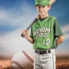 The illuminated backdrop reveals a softly blurred ballpark beyond, adding depth and realism while keeping the focus exactly where it belongs — on your player. The cool blue tones and reflective flooring create a high-impact, modern sports aesthetic that works perfectly for posters, banners, social graphics, and trading card designs.