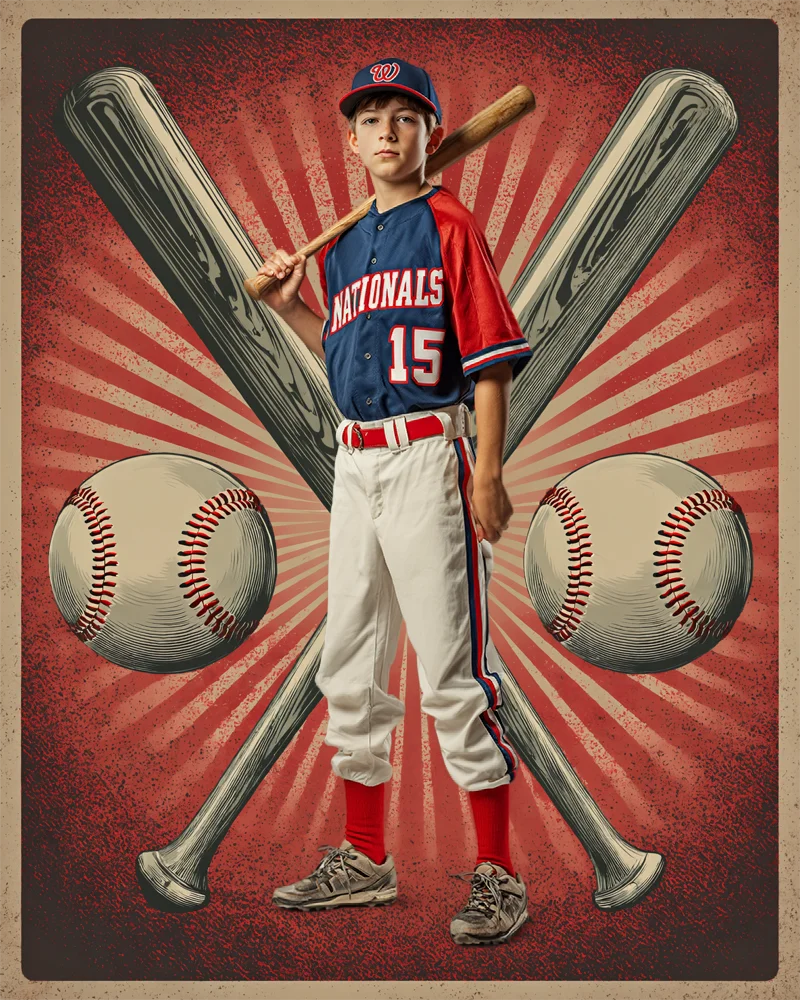 This color adjustable digital background, Baseball Trading Card, features a bold retro graphic design built from oversized illustrated bats, stylized baseballs, and a dynamic radial burst pattern that draws attention directly to the subject. Vintage textures around the edges add depth and character, while the clean central framing ensures smooth subject placement. The blend of classic sports illustration and trading-card structure creates a striking, collectible-style look perfect for standout baseball composites with full color control.