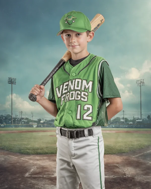 This digital background, Baseball Vintage Trading Card, blends a classic ballpark setting with a subtle retro aesthetic. The scene features a softly textured infield, stadium lighting towers, and a distant suburban skyline beneath a gently hazed sky. The overall composition creates the feel of an old-time baseball card brought to life, with softened edges and an atmospheric backdrop that keeps the focus cleanly centered on the subject—perfect for timeless, nostalgic baseball portraits.