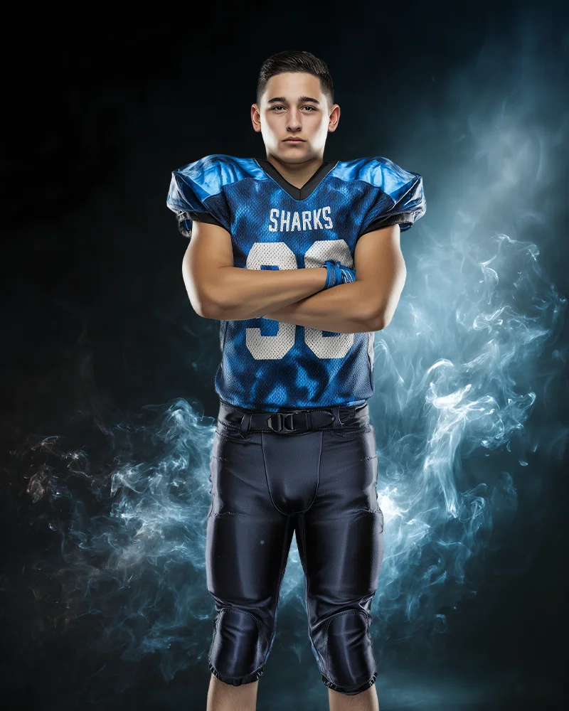 These color adjustable digital backgrounds, Colored Smoke, feature a dramatic atmosphere filled with swirling smoke plumes and softly illuminated haze rising behind the subject. The gradient lighting creates strong separation, while the layered smoky textures add depth and motion without overwhelming the central area. Designed for a bold, cinematic look, these backgrounds are ideal for football composites and other high-impact sports portraits where full color control is needed.