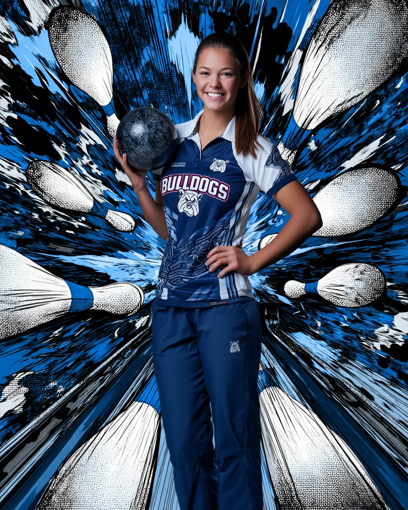 Comic Pow Bowling delivers an explosive comic-book style bursting with motion, speed, and energy as oversized illustrated pins streak across the scene. The bold red, blue, yellow, and black inked artwork creates a dynamic backdrop that instantly grabs attention and gives portraits a fun, high-impact graphic feel. This design is perfect for youth leagues, team posters, and any bowling composite that calls for bold colors and dramatic comic action. A vibrant and playful background that adds excitement and personality to every portrait.