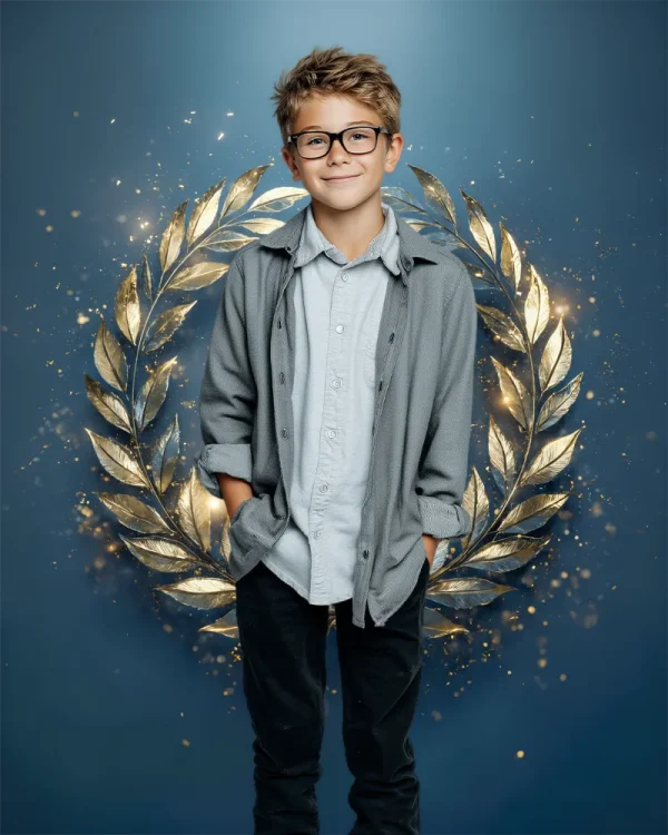 This digital background, Crown of Champions, features an elegant golden laurel wreath set against a softly textured backdrop with floating spark particles that create a sense of prestige and celebration. The wreath’s metallic leaves form a clean, symmetrical frame around the subject, while the subtle atmospheric glow adds depth and refinement. Perfect for school portraits, academic awards, and champion-themed composites with a polished, high-end look.