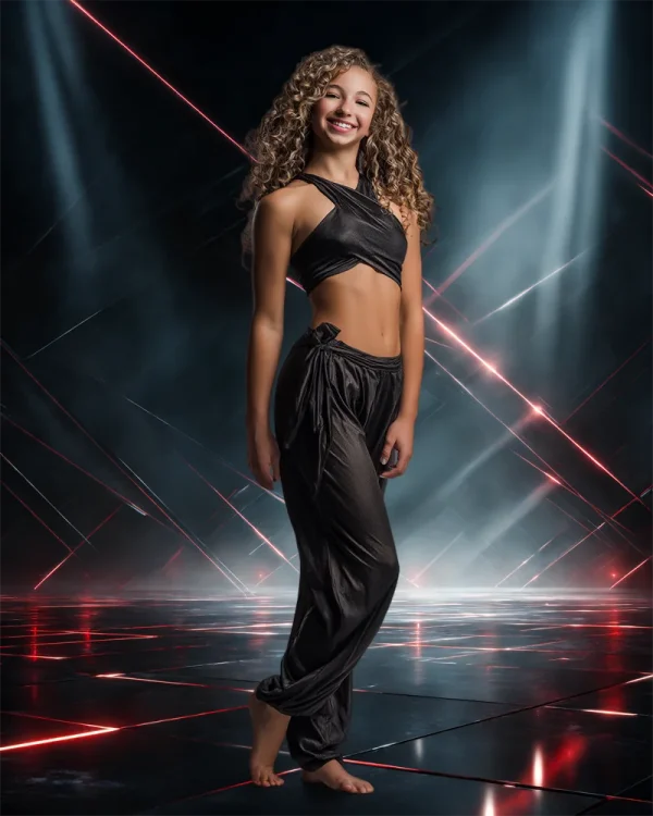 This color adjustable digital background, Ember Matrix, features a sleek futuristic environment with reflective floor panels, drifting atmospheric haze, and glowing diagonal light beams cutting across the scene. The illuminated grid-like reflections add depth and dimension, while the softly diffused center provides clean separation for the subject. Ideal for dance, cheer, and modern sports composites with a cinematic, high-tech aesthetic.