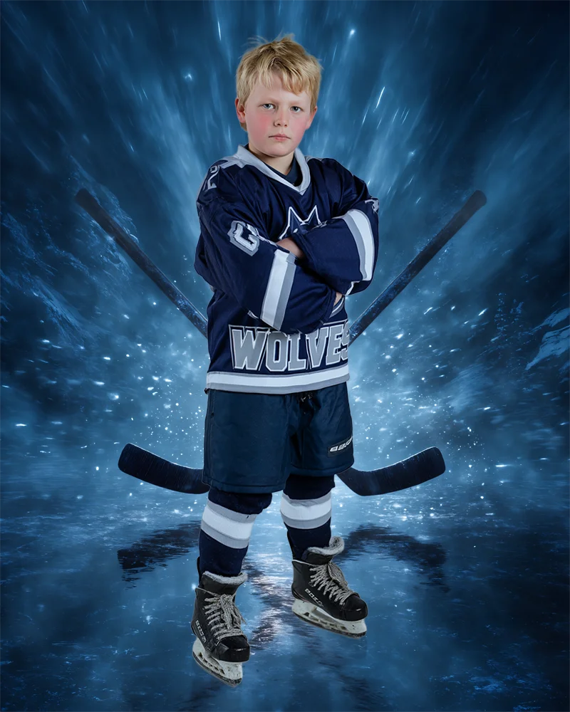The Epic Hockey Sticks digital background delivers an intense icy energy with crossed sticks, frosted textures, and a dynamic burst of motion behind the athlete. Cool blue tones and subtle light streaks create a dramatic, pro-level atmosphere perfect for bold hockey portraits that stand out with crisp detail and attitude.