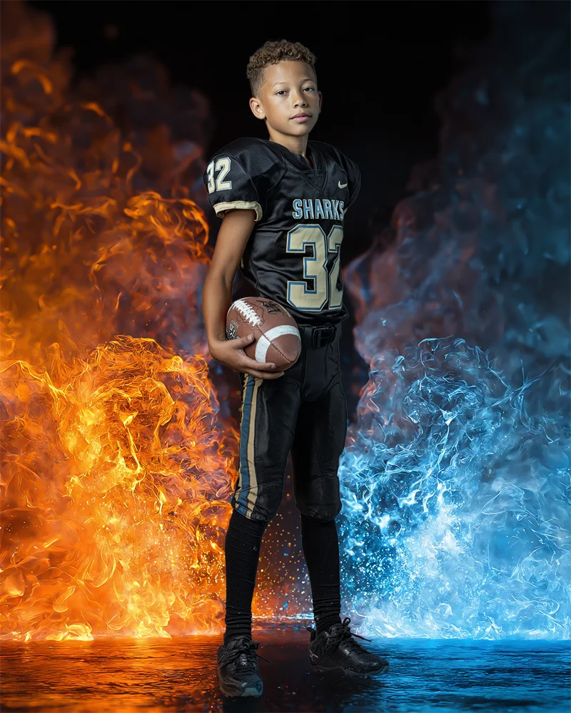 Ignite your sports composites with Fire and Lightning, a dramatic digital background featuring explosive flames colliding with icy smoke. The scene is charged with sparks, glowing embers, and mist swirling across a reflective surface, creating the perfect atmosphere of energy and intensity. Designed with infinite depth of field and crisp details, this backdrop adds cinematic power to any portrait or action shot, making your athletes stand out against the ultimate clash of elements.