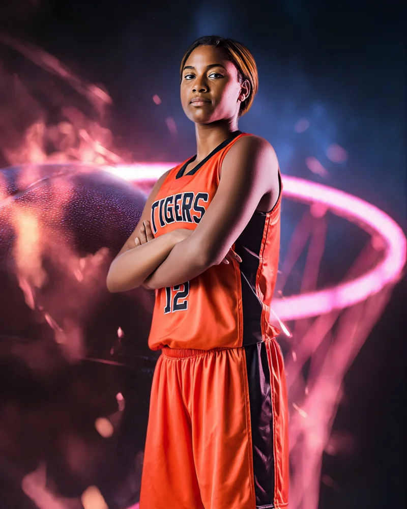 This digital background is color adjustable, allowing you to quickly match team colors while preserving the explosive glow and cinematic depth. The rim naturally frames the subject, making it ideal for basketball portraits, senior banners, posters, and bold social media graphics.