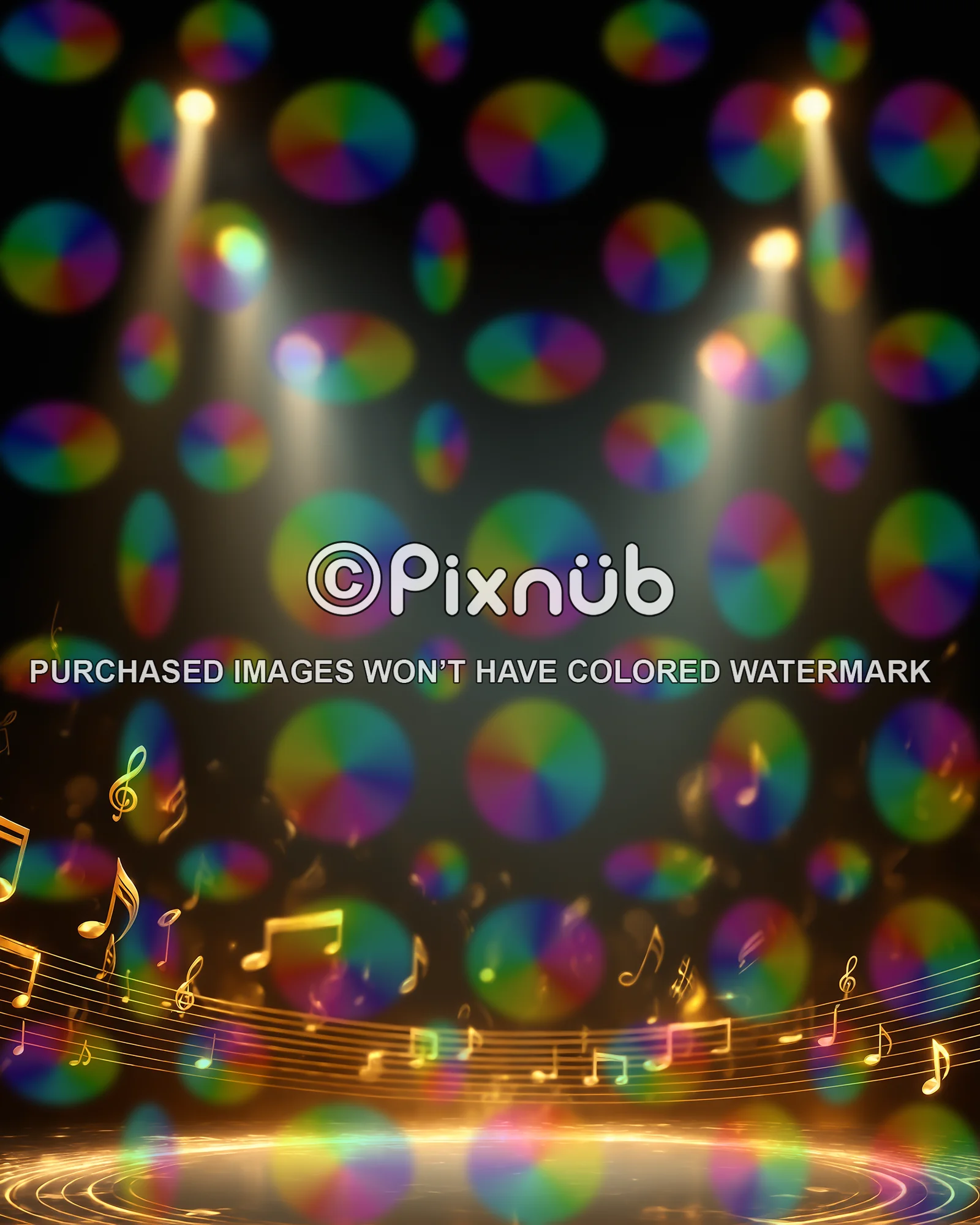 Step into the spotlight with Gold Notes Stage, a digital background for photography. This glowing backdrop features radiant golden music notes floating across illuminated staff lines, framed by dramatic stage spotlights and swirling light rings. Perfect for band, choir, orchestra, or music-themed composites, it creates a powerful, performance-ready atmosphere that makes every subject shine center stage.