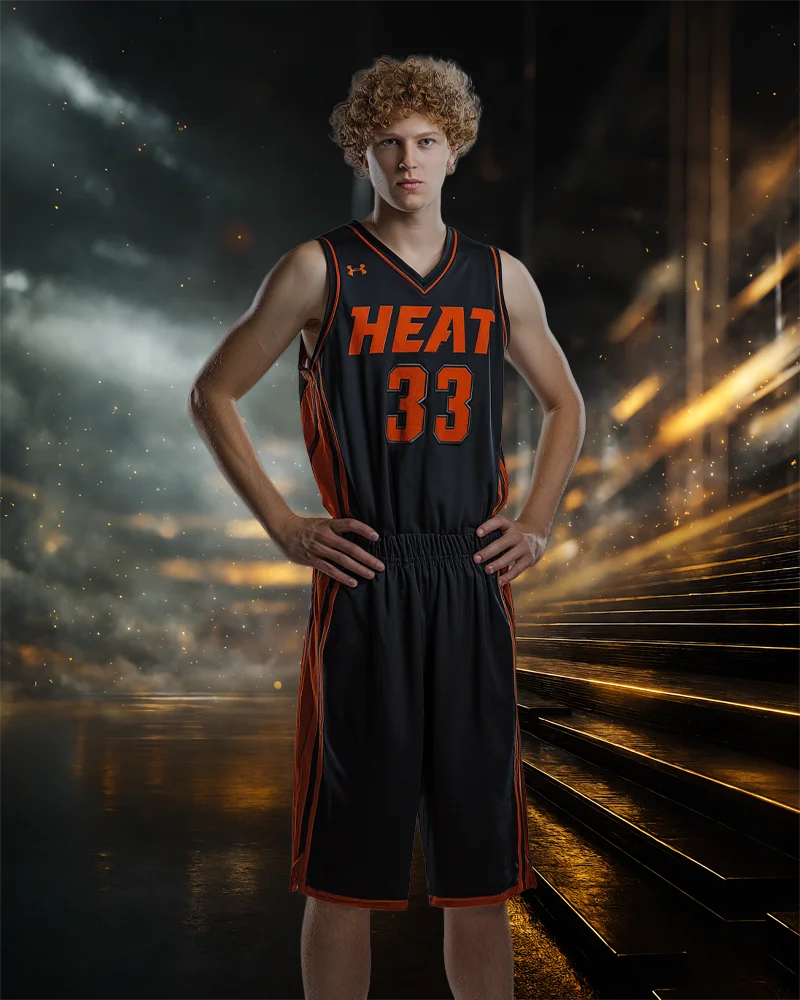 The Golden Bleachers digital background creates a dramatic, arena-ready atmosphere with glowing stair highlights, misty ambient haze, and scattered sparks drifting through the scene. Metallic reflections and cinematic lighting shape a bold, powerful look perfect for basketball portraits and high-impact sports composites.