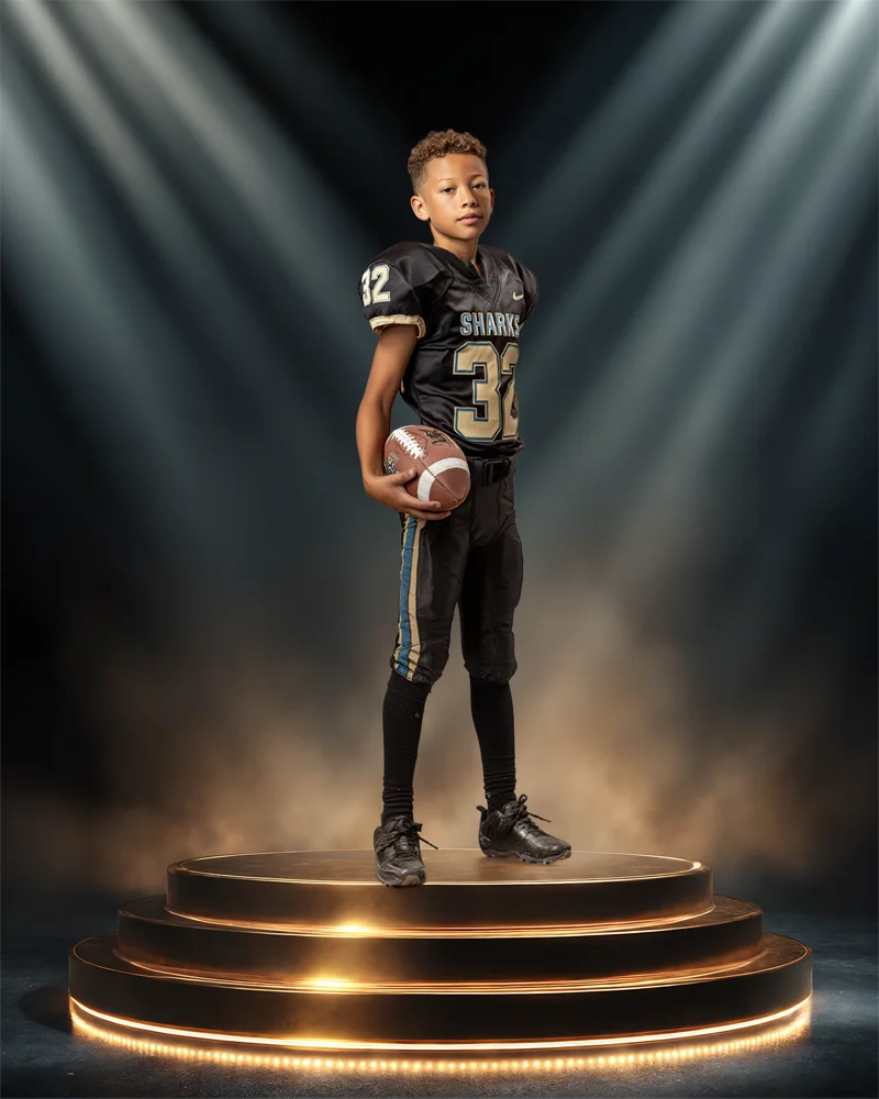Bring the brilliance of achievement into your composites with Golden Podium, a digital background for photography. This design features a sleek three-tiered golden podium glowing under dramatic spotlights, with soft cinematic haze adding depth and atmosphere. Perfect for highlighting athletes, champions, and performers, this background captures the essence of triumph and celebration. Ideal for sports composites, award ceremonies, or any design where victory takes center stage.