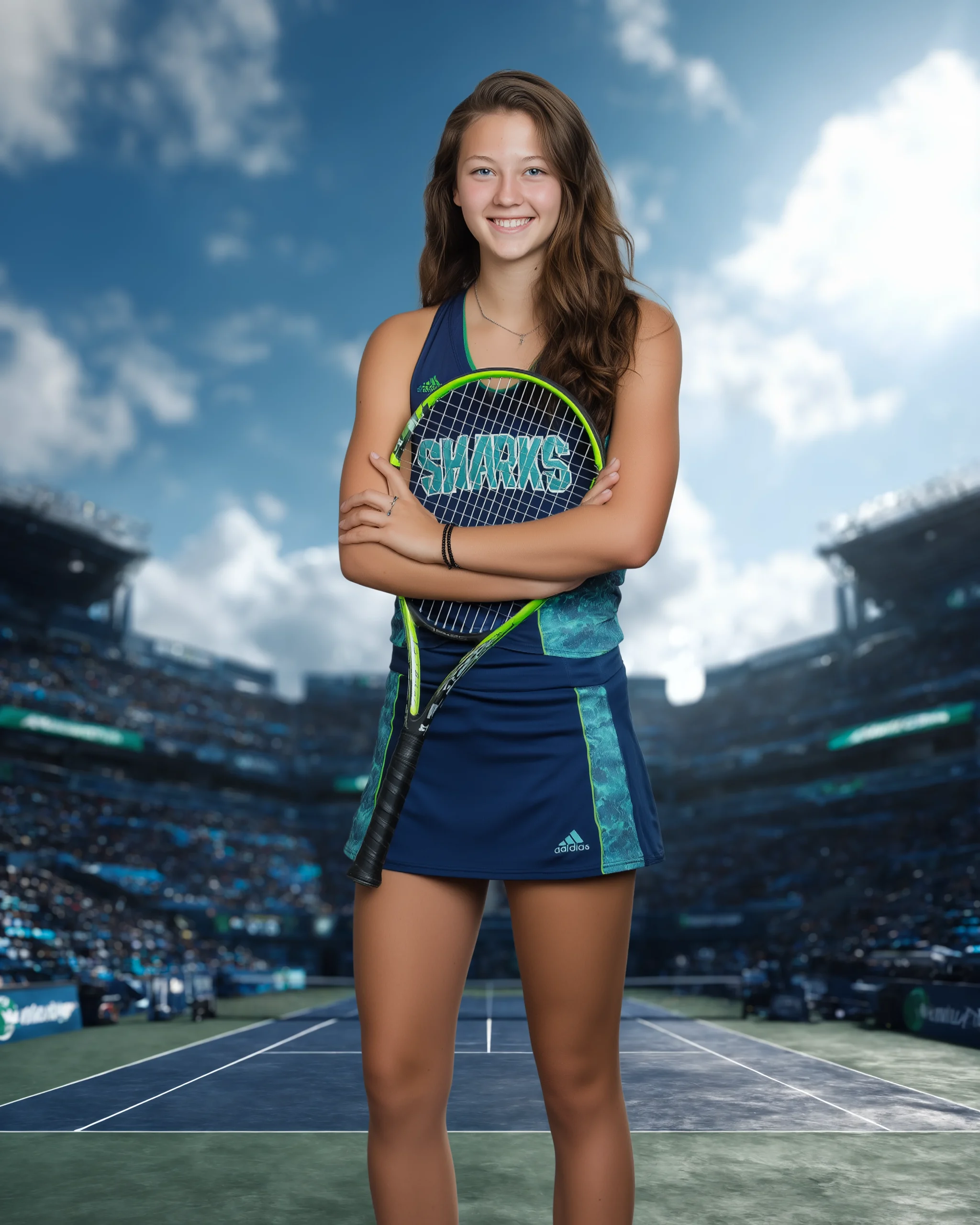 The Grand Tennis Tournament digital background places your athlete on a professional championship court, surrounded by towering stadium seating, bright sky highlights, and a lively match-day atmosphere. Crisp details, clean lighting, and a polished environment make this background perfect for tennis portraits that feel dynamic, competitive, and ready for the big stage.