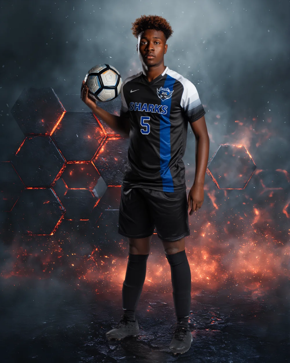 This color adjustable digital background, Lava Hexagons blends molten energy with a modern geometric edge. Cracked hexagon shapes glow with fiery highlights against a smoky, atmospheric backdrop, creating an intense, game-ready look perfect for powerful sports portraits.