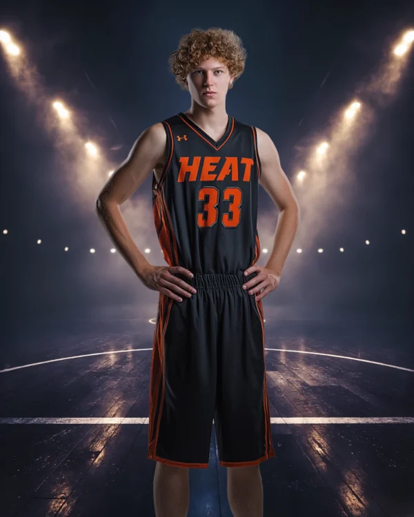 Step into the spotlight with Midnight Hardwood Basketball, a dramatic indoor court digital background designed for bold, high-impact composites. Twin rows of overhead lights cut through swirling haze, creating a powerful V-shaped glow that frames your athlete perfectly at center court.