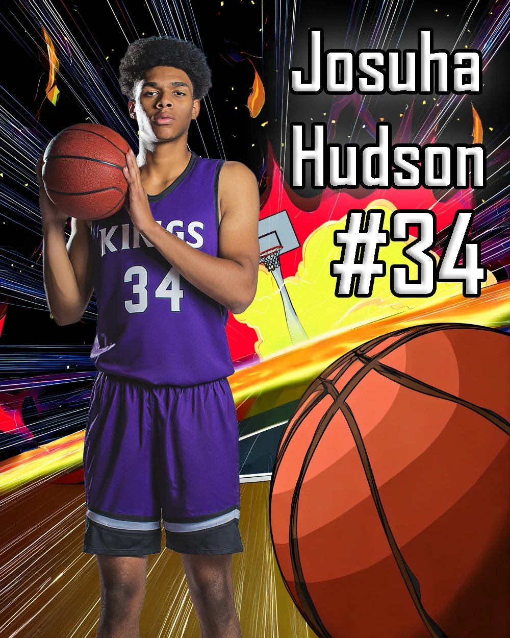 The centered composition and dramatic contrast make it ideal for basketball portraits, player posters, trading cards, social media graphics, and action-driven sports designs. This digital background pairs especially well with strong poses and confident expressions, delivering a modern comic-inspired look that stands out instantly.