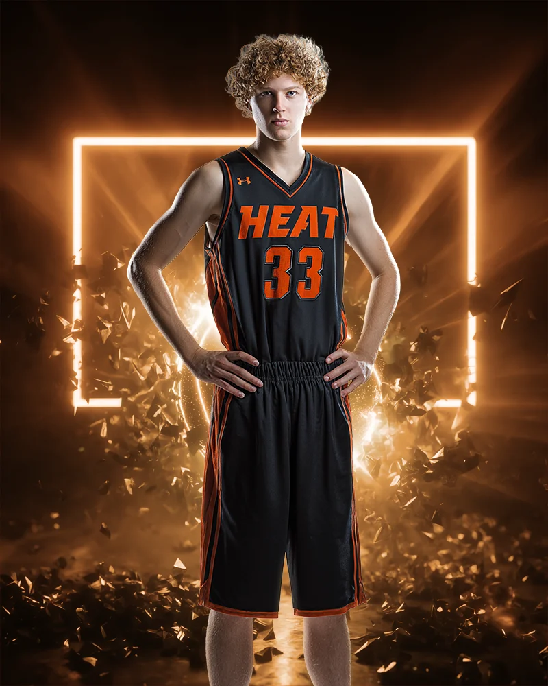 Break boundaries with Shattered Hoop. This digital background showcases a luminous basketball glowing with electric energy as it explodes through shards of crystal and debris. A radiant neon frame and beams of light add futuristic depth and dimension, creating a cinematic stage for your subject. Dynamic and high-impact, this design delivers a sense of power and motion that elevates your sports composites, making every image feel like a highlight moment.