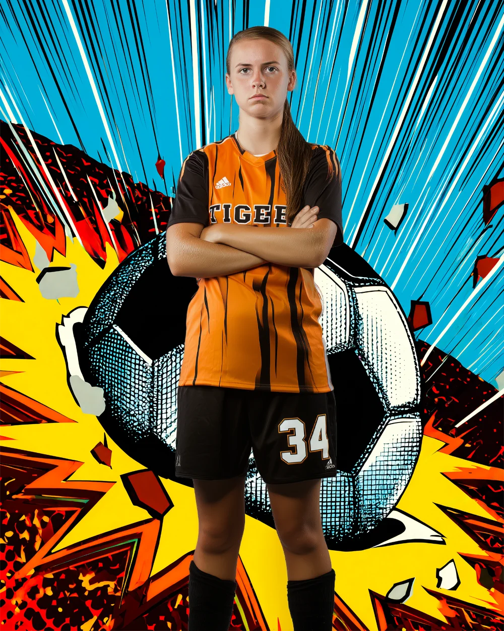 The strong vertical composition keeps the player centered while the graphic explosion adds depth, motion, and intensity without overwhelming the subject. This digital background is ideal for soccer portraits, player posters, trading cards, social media graphics, and action-focused designs where a powerful, comic-inspired look helps athletes stand out.