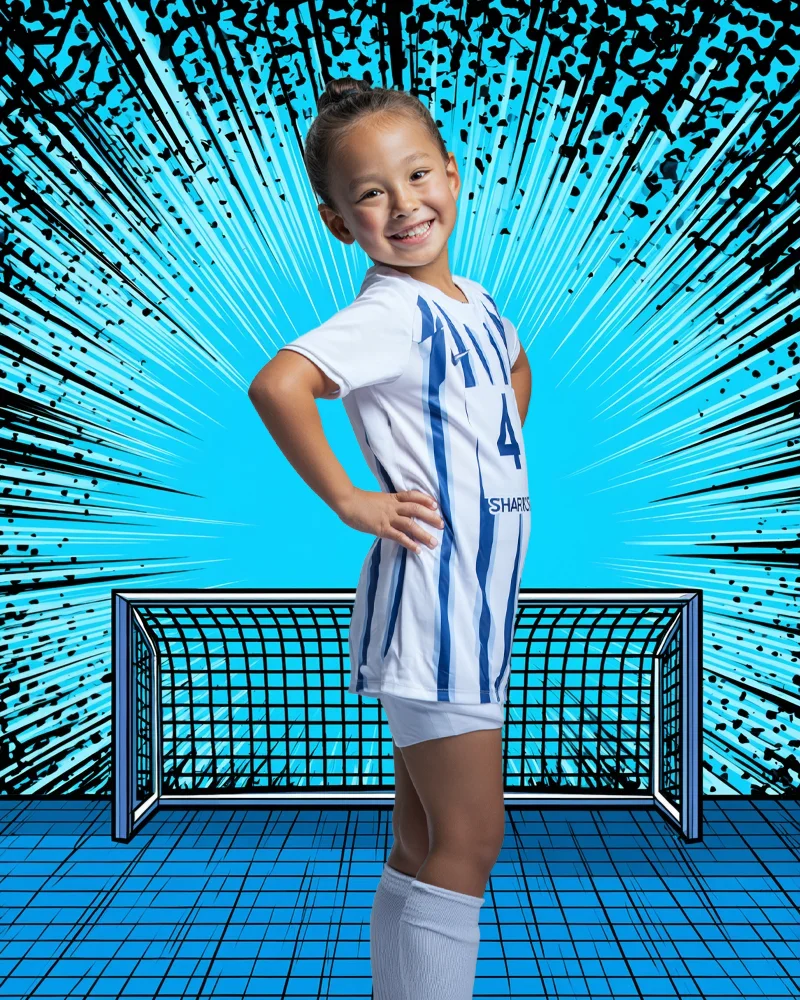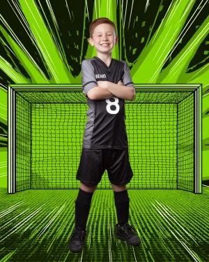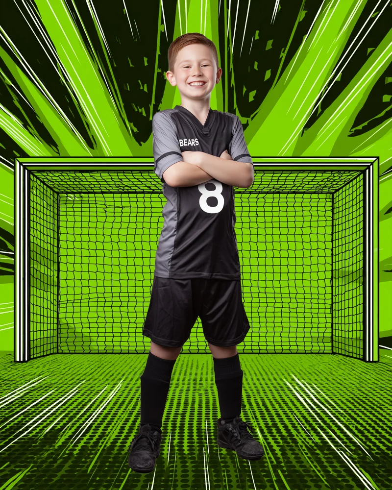 Soccer Net Impact are a bold, illustrated digital backgrounds featuring a stylized soccer goal framed by explosive radial energy lines and graphic ink textures. The high-contrast designs and comic-inspired motion create a powerful focal point that draws attention straight to the goal, while the clean floor grid provides a strong base for subject placement. This digital background is perfect for youth soccer composites, action posters, trading cards, and energetic sports designs that need a fun, high-impact graphic style.