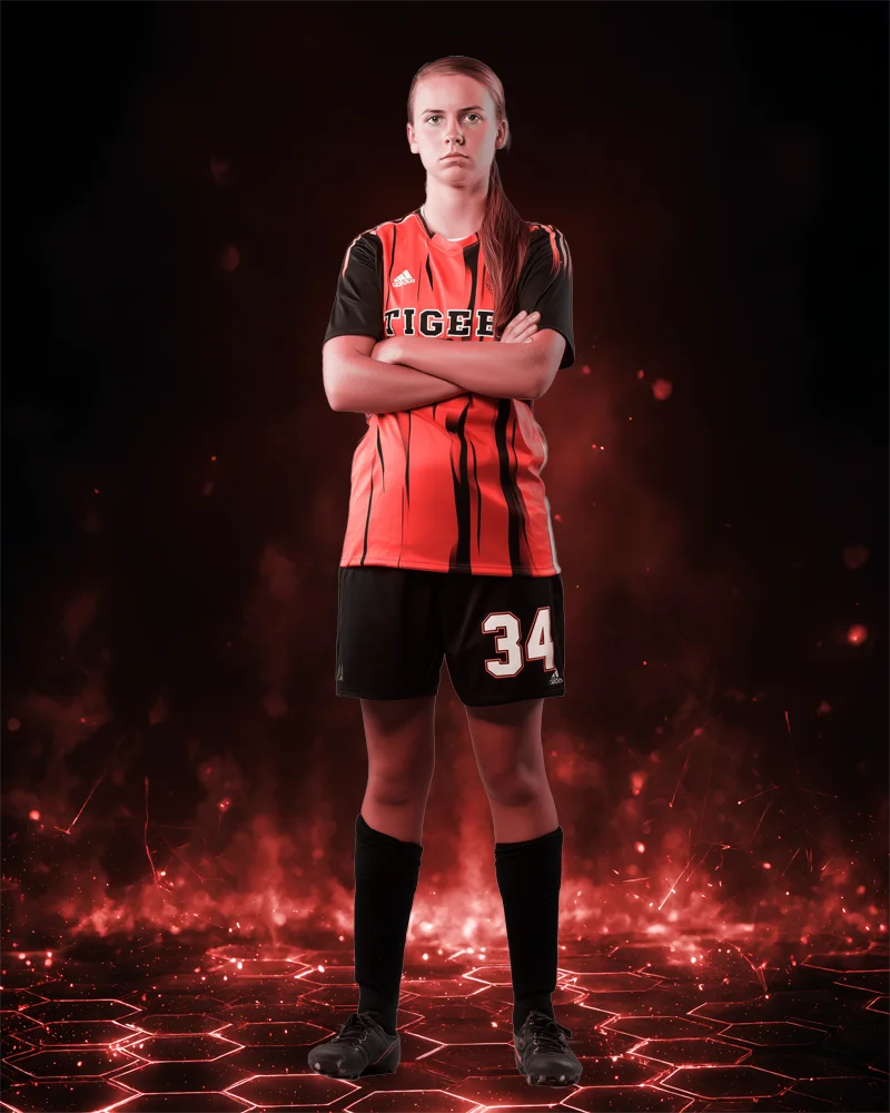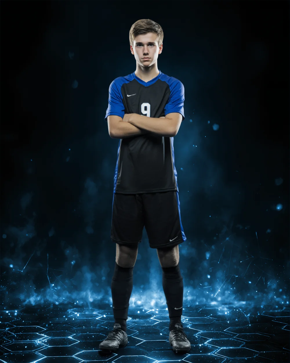 The Soccer Smoke digital background is a bold, futuristic design featuring a glowing hexagon-grid floor, electric blue atmospheric haze, and crisp studio lighting that enhances any athlete’s presence. This color adjustable background lets you fine-tune the tones to perfectly match any team or theme, making it ideal for dramatic sports portraits and dynamic full-body composites.
