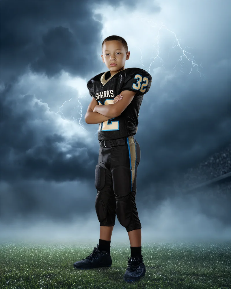 Step into the intensity of game day with this dramatic digital background. Featuring a stormy sky split by vivid lightning bolts, fog drifting low across the turf, and a cinematic atmosphere, this backdrop captures the raw energy of football under pressure. Perfect for sports composites that demand power, drama, and bold visual impact.