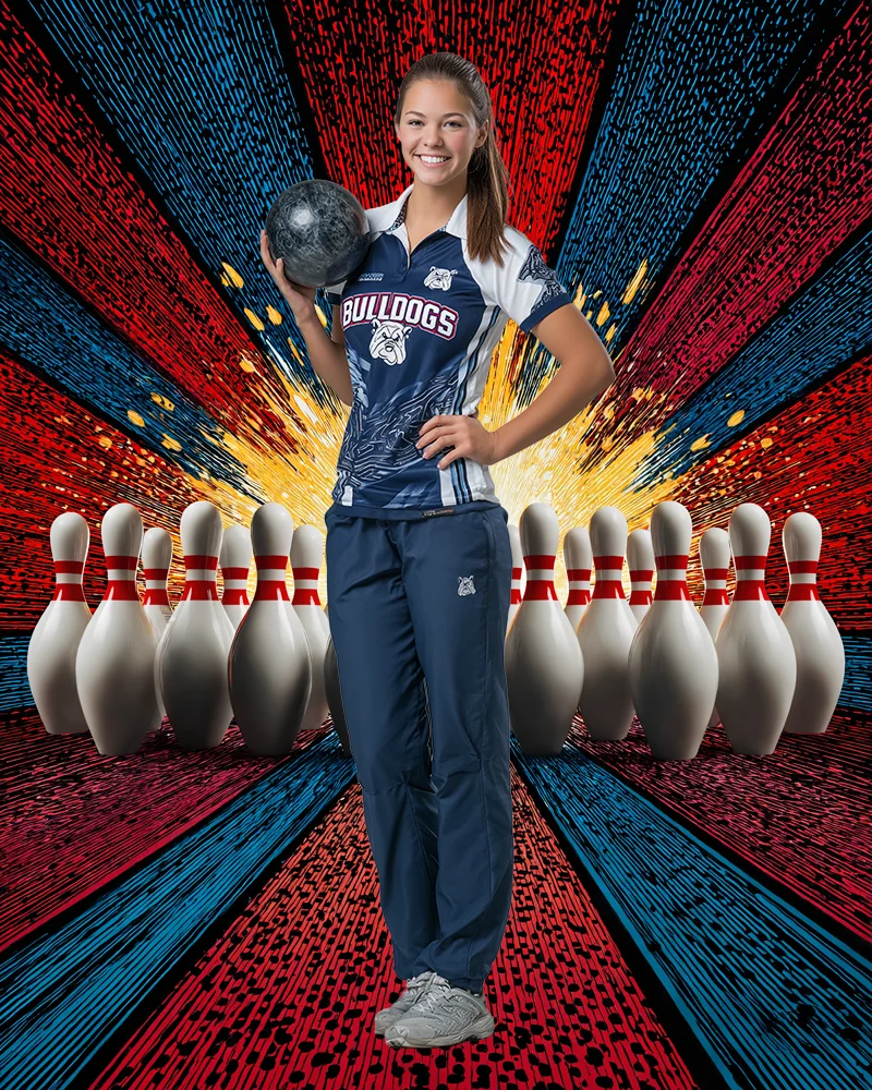 Victory Pins delivers a bold comic-inspired bowling backdrop designed for high-energy sports portraits, featuring an explosive graphic burst behind a full set of pins for dramatic motion and visual impact. The vibrant red, yellow, and blue streaks create a powerful focal point while keeping the layout clean for cutouts and composites, making it perfect for youth leagues, high school teams, and tournament-style graphics. A dynamic and colorful background that instantly elevates bowling portraits.